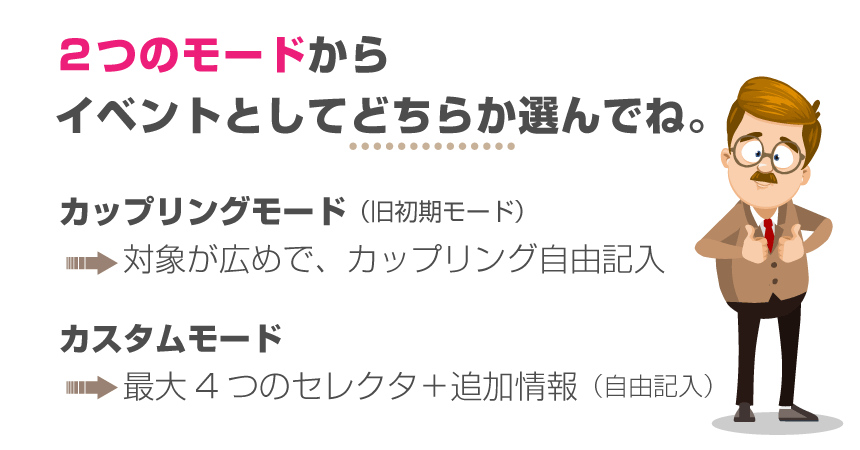 対象ジャンルが絞り込まれているイベント向け0~4つのセレクター(選択肢最大99個)と追加情報欄A、Bが設置可能です。 カスタムセレクター・0個から最大4個設置可能各セレクターは最大99の選択肢を設定可 ・追加情報欄A(設置ON/OFF可) ・追加情報欄B(設置ON/OFF可)
