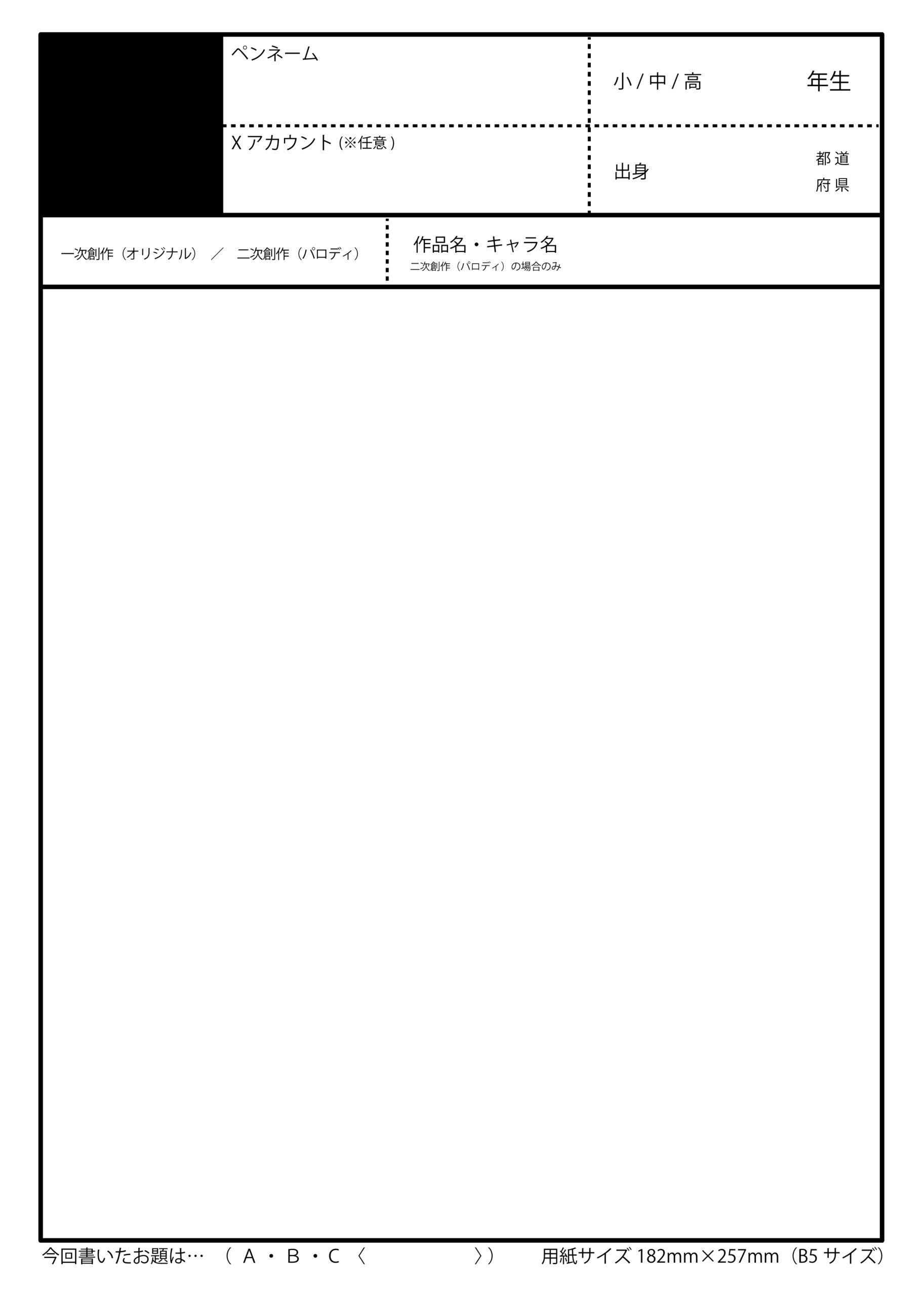 - 一次創作(オリジナル)/二次創作(パロディ)は不問